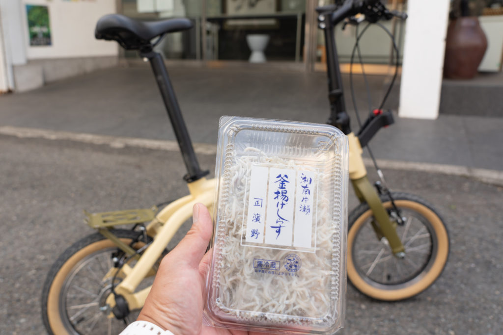 購入したしらすとKOLiBRIを一緒に記念撮影してみました。ちなみに浜野さんのしらすは、他と比べてサイズが大きくて立派! さすが網元です。