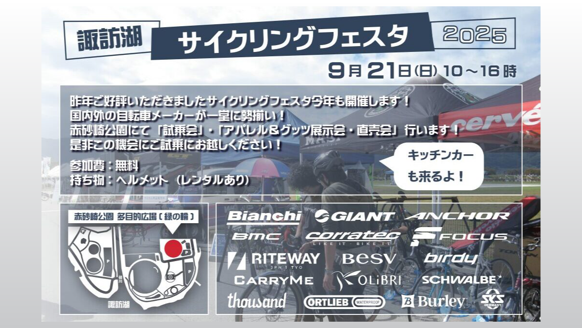 長野県諏訪郡で開催されるイベント「諏訪湖サイクリングフェス2025」に出展させて頂くこととなりました …